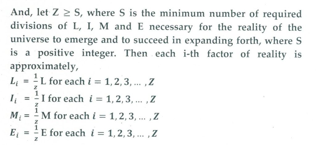 Another observation is with regards to the case when Z becomes smaller than S. Meaning that, L, I, M and E are no longer divided into the minimum number of points or bundles or packets required to keep from forming a unified concentration of total oneness. In such a case, it is possible that the c-universe will eventually be able to continue to decrease the values of Z until Z reaches 1.